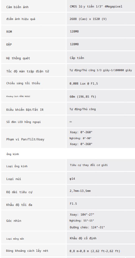 Cảm biến hình ảnh CMOS 4MP, 1/3”, độ sáng thấp , độ nét hình ảnh cao Đầu ra 4MP (2560 × 1440)@25/30 fps, tối đa. 1520@20 hình/giây
