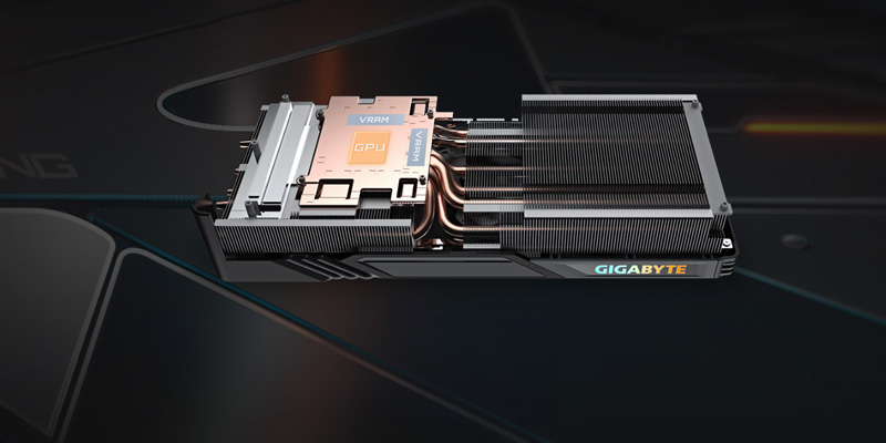 Tấm đồng lớn tiếp xúc trực tiếp với GPU, kết hợp với các ống dẫn nhiệt composite giúp truyền nhiệt nhanh chóng của GPU và VRAM tới tản nhiệt.