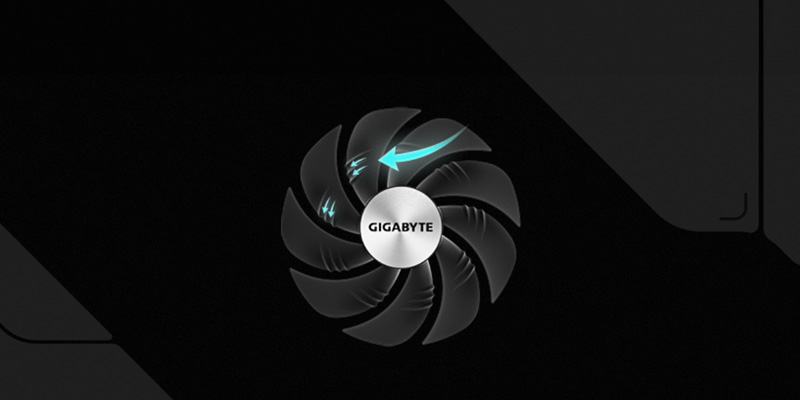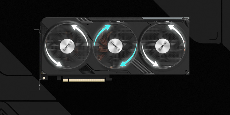 VGA Gigabyte GeForce RTX 4070 Super Gaming OC 12G GDDR6X với thiết kế quạt quay luân phiên xoay các quạt liền kề theo hướng ngược lại để hướng luồng khí giữa hai quạt, làm giảm nhiễu loạn và tăng cường áp suất luồng khí.
