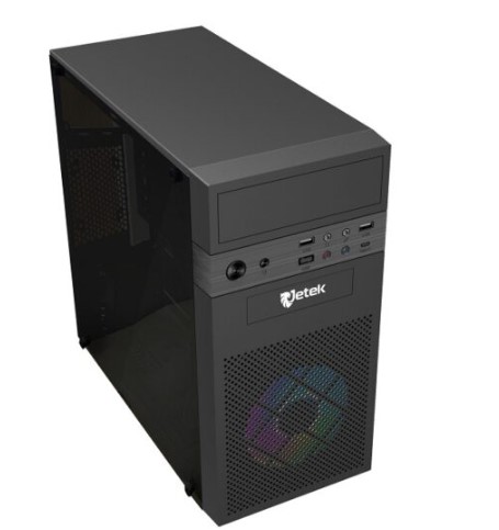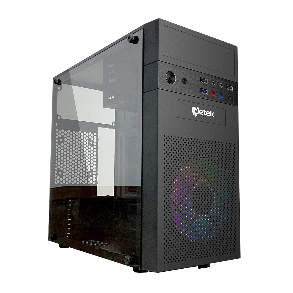 Case JETEK GAME V12 được bao phủ với độ dày 0.4mm SPCC Black Coating. Phía trước được làm bằng nhựa ABS màu đen, lỗ làm mát. Bên trái được làm bằng Acrylic.