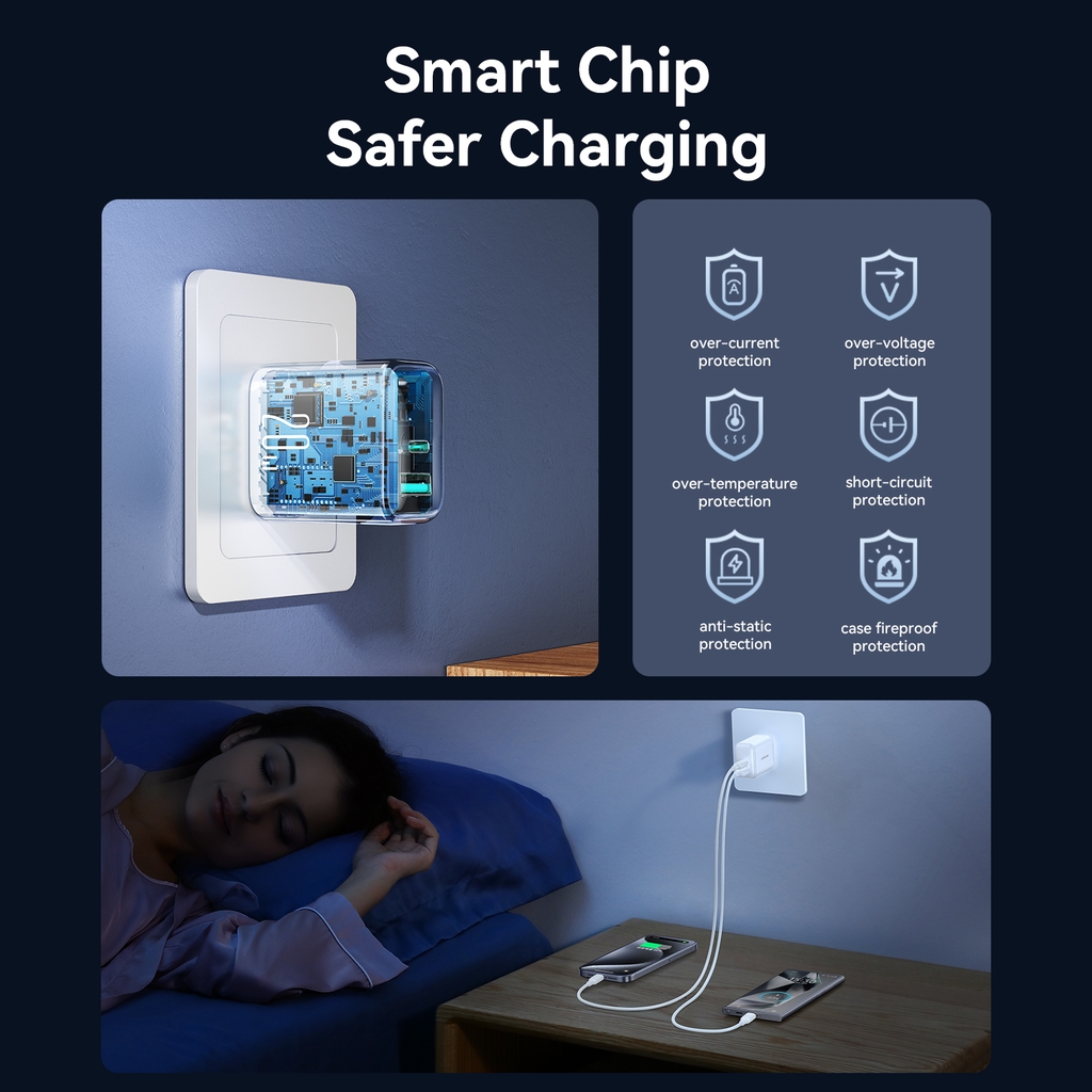 - Công nghệ sạc thông minh: Tự động điều chỉnh dòng điện phù hợp với từng thiết bị, bảo vệ thiết bị khỏi quá tải, ngắn mạch, quá nhiệt.
