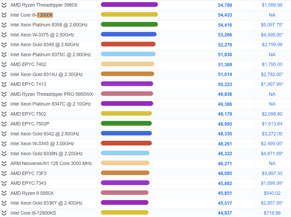 Trong thử nghiệm đa luồng, vi xử lý Intel Core i9-13900K đạt 54433 điểm, cao hơn 19% so với vi xử lý Ryzen 9 5950X của AMD trong các thử nghiệm tương tự. Tuy nhiên, bộ vi xử lý dòng Ryzen 7000 mới nhất của AMD bị thiếu trong thử nghiệm PassMark, ngay cả với các CPU thế hệ tiếp theo của AMD được phát hành trước Intel và dòng Raptor Lake của họ.