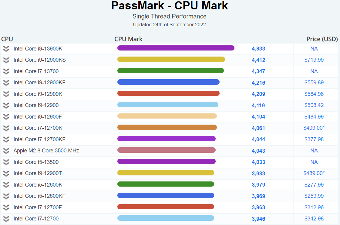 Sự gia tăng đáng kể về tần suất đi kèm với các CPU Intel Core Raptor Lake thế hệ thứ 13 đã được thử nghiệm trước đây thông qua các điểm benchmark khác nhau. Tuy nhiên, trong một ví dụ PassMark gần đây, hiệu suất luồng đơn của Core i9-13900K được kiểm tra và bộ xử lý đạt điểm số cao hơn 9,5% so với bộ vi xử lý Alder Lake trước đó, đạt 4833 điểm.
