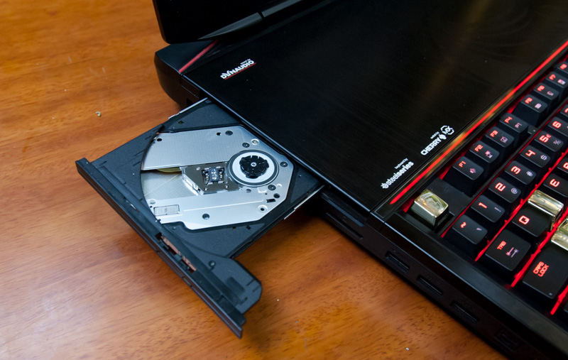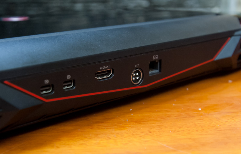 Chiếc ổ này có thiết kế khá kín đáp khi nó nằm bên trong phần nắp nhôm phía trên bàn phím thay vì nằm bên trong phần thân máy bên dưới. Bên cạnh phải chỉ có duy nhất 2 cổng USB 3.0. Các cổng kết nối màn hình đều được được đặt phía sau, giữa 2 họng tản nhiệt lớn gồm 2 cổng mini DisplayPort, 1 cổng HDMI, LAN và 1 jack nguồn 4 chấu.
