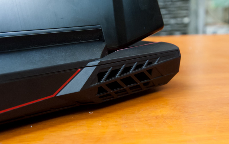 Kể từ đây thì chúng ta sẽ thấy những điểm mới lạ trên thiết kế của một chiếc laptop. Ngay bên dưới màn hình là một khoảng trống, chính xác hơn là một chiếc nắp lớn bằng nhôm phay xước màu đen và trên tấm nhôm này còn được khắc chìm hình rồng xương. Phía trên cùng của tấm nhôm là một hàng các lỗ nhỏ li ti chạy dọc theo chiều dài và đây chính là hệ thống loa Dynaudio của máy.