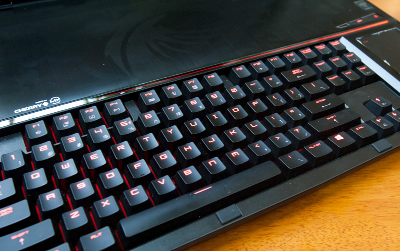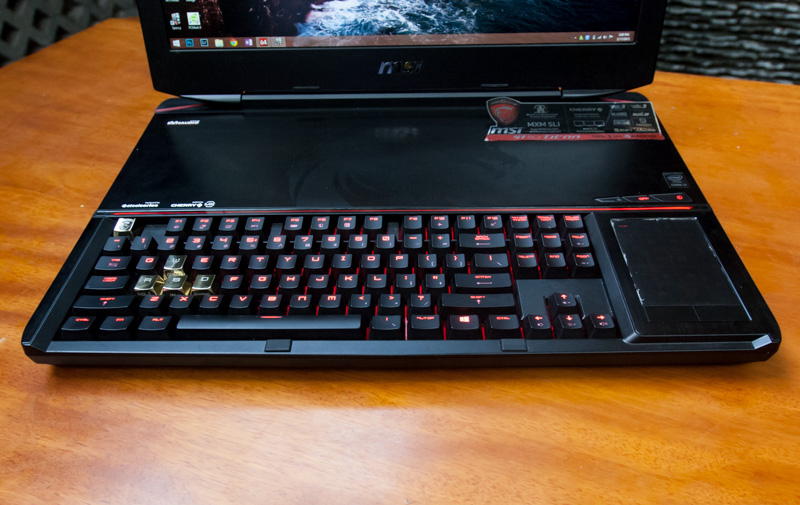 Tiếp theo là phần đặt biệt nhất trong nội thất của GT80 Titan - bàn phím cơ và bàn rê kiêm phím số ảo. Đây là chiếc laptop đầu tiên trên thế giới được trang bị bàn phím cơ và chiếc bàn phím này cũng là một phần khiến máy tăng cân. Toàn bộ phần bàn phím được đẩy lùi ra sát cạnh trước của máy và GT80 Titan không có phần chiếu nghỉ tay như các thiết kế truyền thống. Để gõ phím tốt hơn thì MSI đã tặng kèm một tấm nghỉ tay bằng đệm mút mềm, khá êm.
