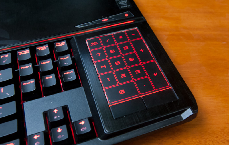 Bên cạnh bàn phím là bàn rê hình chữ nhật đặt dọc thiết kế rất lạ. Thiết kế bàn rê đặt bên cạnh bàn phím trước đây từng được Razer áp dụng trên dòng Blade Pro 17" nhưng bàn rê của Razer thì tích hợp giao diện Switchblade UI tạo nên màn hình thứ 2.