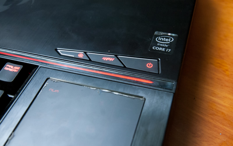 Phía trên bàn rê có 3 chiếc nút hình tam giác thiết kế khá đẹp. Chức năng của 3 nút này là nút nguồn, nút ở giữa chuyển đổi card đồ họa rời/onboard và nút kích hoạt quạt tản nhiệt ở chế độ hiệu năng cao.