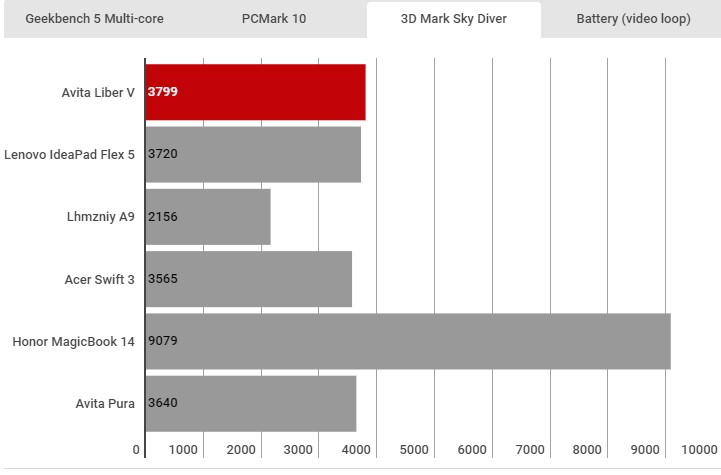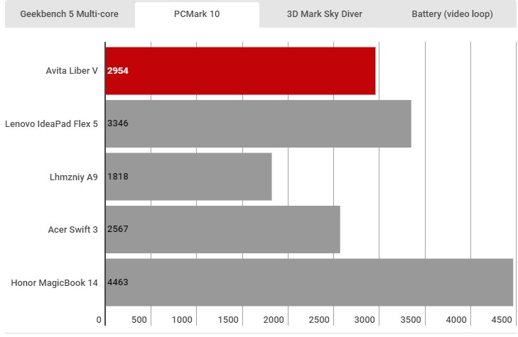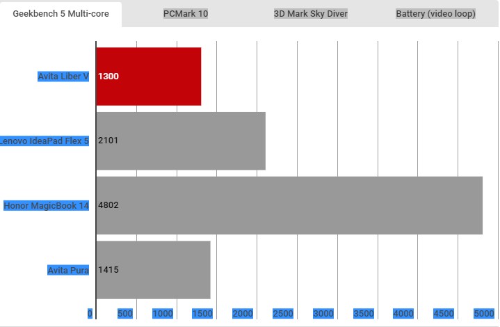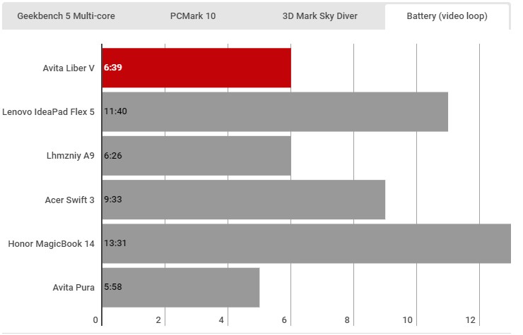 Avita không liệt kê kích thước pin của Liber V theo Wh nhưng nói rằng bạn sẽ nhận được 10 giờ năng lượng chỉ với một lần sạc. Lặp lại một video 720p với độ sáng của màn hình bị khóa ở 120 nits, tôi đã quay được sáu giờ 39 phút. Hầu hết các máy tính xách tay ngày nay sẽ cung cấp cho bạn ít nhất tám giờ, vì vậy đó là một kết quả đáng thất vọng.