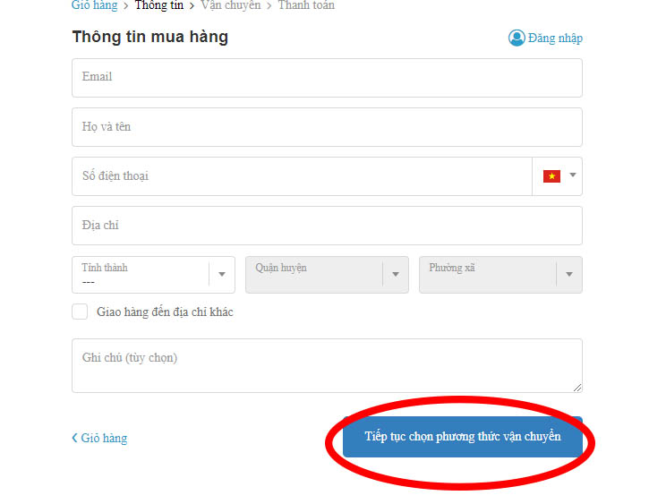 Bước 3: Nhập thông tin cụ thể và nhấn vào "Tiếp tục chọn phương thức vận chuyển"