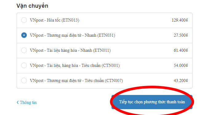Bước 4: Chọn đơn vị vận chuyển phù hợp và nhấn vào "Tiếp tục phương thức thanh toán"