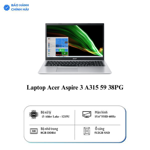 Laptop Acer Aspire 3 A315 59 38PG i3 1215U (NX.K6TSV.00A) là lựa chọn hoàn hảo cho người dùng muốn một chiếc laptop học tập - văn phòng cấu hình ổn định ở mức giá đặc biệt phù hợp cho học sinh và sinh viên, sẽ là lựa chọn lý tưởng khi mình quyết định gửi gắm niềm tin vào một em laptop ở mức giá rẻ để cùng mình cân mọi deadline.