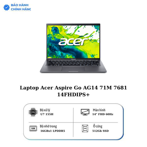 Laptop Acer Aspire Go AG14 71M 7681 là một trong những sản phẩm nổi bật trong dòng laptop của Acer, nhắm đến nhu cầu học tập, làm việc và giải trí hằng ngày. Với thiết kế hiện đại, hiệu năng tốt và nhiều tính năng nổi bật, sản phẩm này đã nhanh chóng thu hút sự chú ý của người tiêu dùng. Trong bài viết này, chúng ta sẽ khám phá chi tiết về chiếc laptop này để giúp bạn hiểu rõ hơn về những gì nó mang lại.