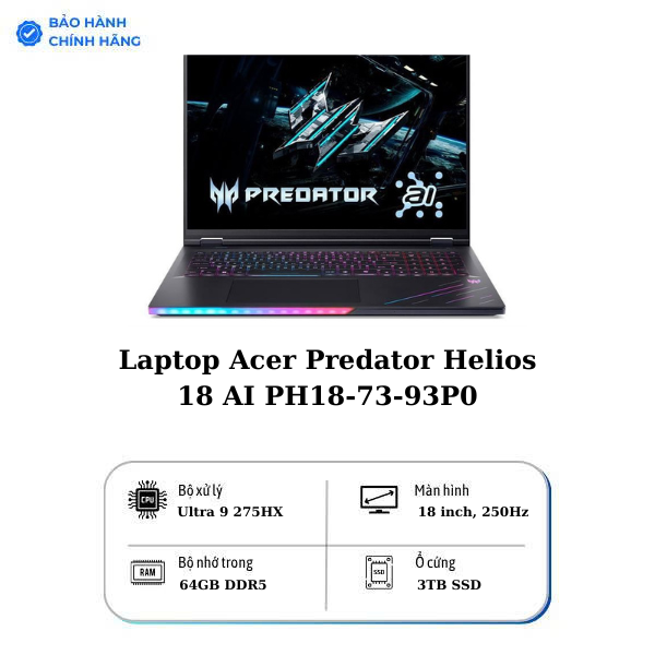 Laptop Acer Gaming Predator Helios 18 AI PH18-73-93P0 sử dụng CPU Intel Core Ultra 9 275HX với 24 lõi và 24 luồng, tốc độ cơ bản 4.6 GHz và turbo boost đạt 5.4 GHz. Công nghệ GPU hiện đại mang lại hiệu suất tuyệt vời cho việc đa nhiệm. Hiệu suất bền bỉ của thiết bị được thể hiện qua năng lực xử lý mạnh mẽ các trò chơi và các tác vụ yêu cầu tài nguyên lớn.