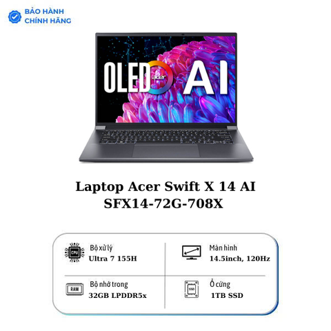 Laptop Acer Swift X14 SFX14 72G 708X được trang bị hệ thống phần cứng bao gồm CPU Intel® Core™ Ultra 7 155H 16 nhân 22 luồng với mức xung nhịp từ 1.40GHz - 4.80GHz mang lại hiệu năng mạnh mẽ, xử lý mượt mà các tác vụ thiết kế đồ hoạ, render video,... trên các phần mềm Photoshop, AI, Premiere,... hay thỏa sức cho bạn sáng tạo nội dung.