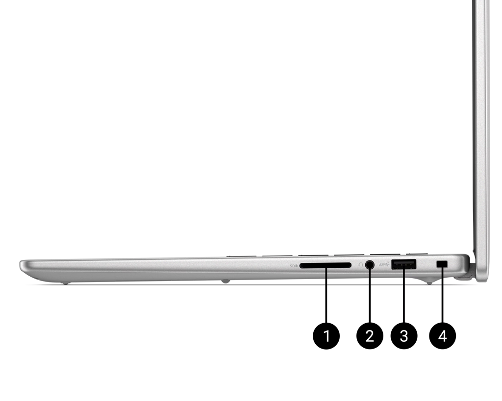 Laptop Dell 14 DC14250 được trang bị đầy đủ các cổng kết nối thông dụng như USB-A, USB-C, HDMI và jack tai nghe, giúp kết nối nhanh chóng với màn hình ngoài, máy chiếu hay các thiết bị ngoại vi.