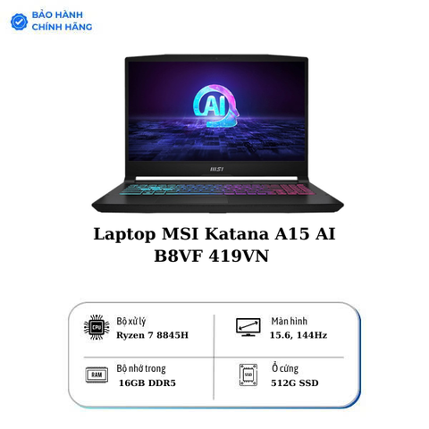 Laptop Gaming MSI Katana A15 AI B8VF 419VN được giới game thủ yêu thích nhờ thiết kế đậm khí chất, cấu hình nổi trội, màn hình ấn tượng cho tốc độ mượt mà. Sở hữu mức giá bán 27,890,000₫ đây sẽ là trợ thủ đắc lực giúp bạn tỏa sáng với phong cách chinh phục game đỉnh cao