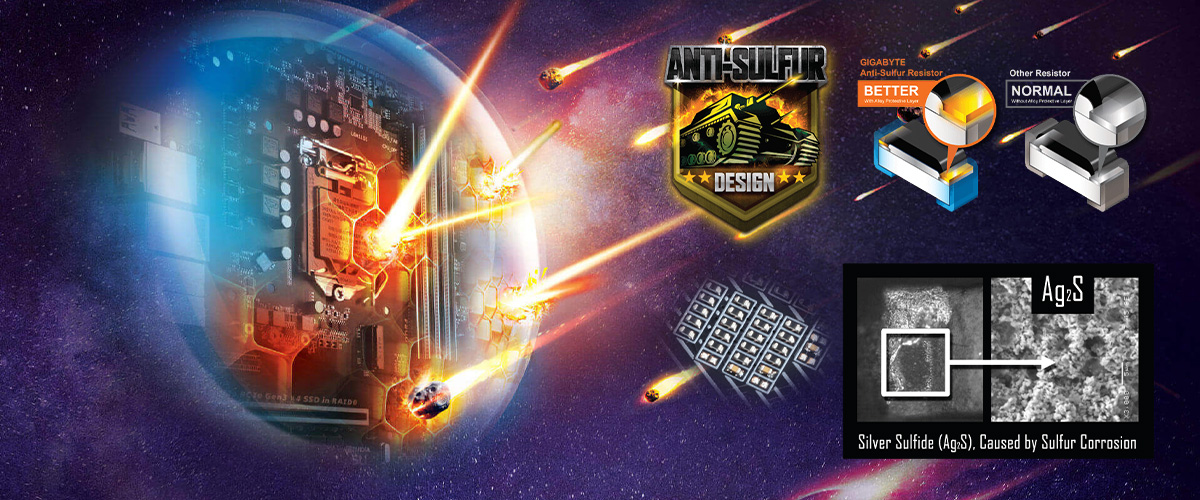 Thiết kế Anti-Sulfur chống lại sự ăn mòn của các hợp chất lưu huỳnh trong không khí xuyên qua các điẹn trở cực nhỏ trên bo mạch chủ, giảm tuổi thọ của sản phẩm.