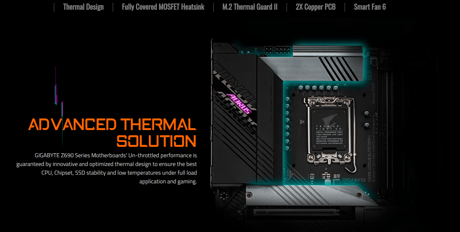 - Gigabyte Z690 AORUS ELITE sở hữu thiết kế ATX với ngoại hình nam tính, đậm chất Gaming. Nổi bật là các khối heatsink đẹp mắt bao phủ ở các khu vực quan trọng trên bo mạch chủ.