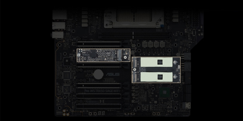 Mainboard PC ASUS Pro WS TRX50-SAGE WIFI cũng cung cấp ba khe cắm M.2: 2 khe PCIe 5.0 và 1 khe PCIe 4.0—để nâng cao tính linh hoạt và hiệu suất lưu trữ. Cấu hình này lý tưởng cho những người sáng tạo làm việc với các tệp video lớn vì nó hỗ trợ cấu hình RAID trên nhiều thiết bị NVMe để đạt được băng thông I/O lớn và đảm bảo phát lại liền mạch trong các khoang chỉnh sửa.