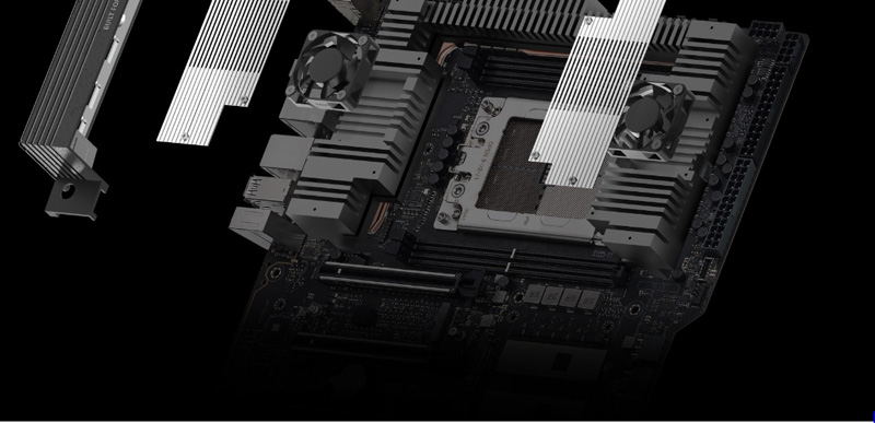 Mainboard PC ASUS Pro WS TRX50-SAGE WIFI trang bị hai tản nhiệt VRM dày được kết nối bằng ống dẫn nhiệt và liên kết với tấm chắn I / O bằng kim loại, cung cấp diện tích bề mặt và khối lượng lớn để xử lý nhu cầu điện năng của bộ vi xử lý Intel thế hệ thứ 13 với hiệu suất cao.
