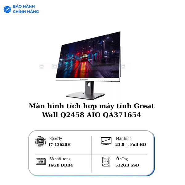 Màn hình tích hợp máy tính Great Wall Q2458 AIO QA371654 - 16GB RAM, 512GB SSD là thiết bị để bàn cao cấp, sở hữu thiết kế hiện đại tất cả trong một, trang thiết bị xử lý Intel Core i7-13620H mạnh mẽ, RAM 16GB và ổ cứng SSD 512GB cho khả năng xử lý nhanh chóng và mượt mà. Màn hình 23.8 inch Full HD hiển thị sắc nét, kèm theo bàn phím và chuột không dây tiện lợi. Máy phù hợp cho công việc văn phòng, học tập hoặc giải trí với kết nối không dây Wi-Fi ac và Bluetooth tích hợp.