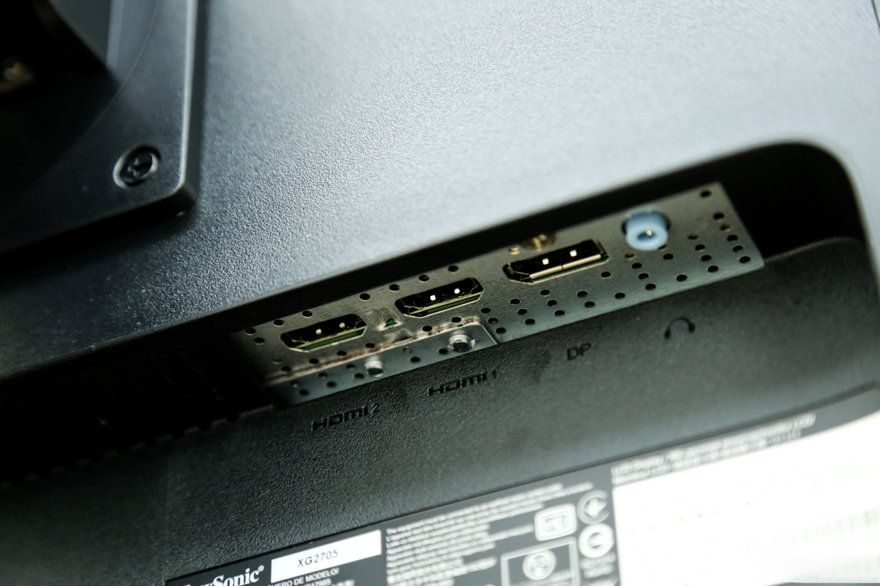 Số lượng cổng kết nối trên XG2705 không có sự khác biệt với những sản phẩm gần đây của ViewSonic, gồm hai cổng HDMI (2.0 và 1.4), một cổng DisplayPort và một cổng xuất âm thanh 3.5mm, tiếc là không có cổng Type-C hay USB nào.