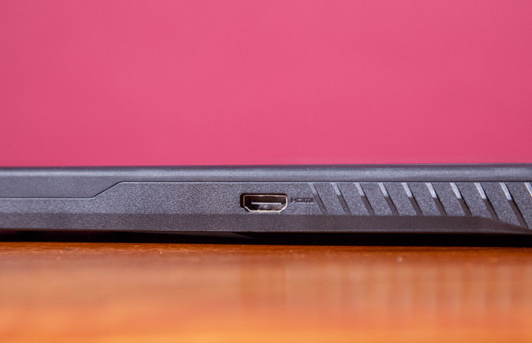 Ở mặt sau của máy tính xách tay là đầu vào HDMI đơn độc để kết nối với màn hình.