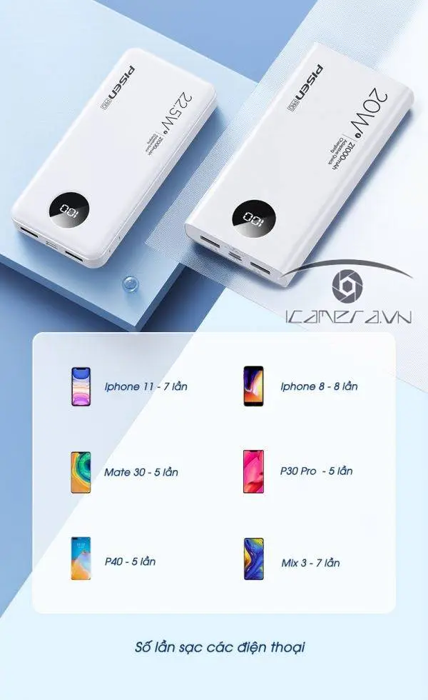 Dung lượng lớn 20.000mah, sạc một lần dùng cả tuần, giúp bạn không còn lo lắng về pin điện thoại khi công tác du lịch dài ngày.
