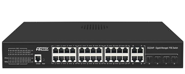 APTEK SG2244P bao gồm 24 cổng PoE / PoE + chuẩn 802.3at/af hỗ trợ hoàn hảo cho việc cung cấp nguồn qua cáp mạng cho các thiết bị Access Point, Camera IP… APTEK SG2244P cung cấp tính năng voice VLAN và QoS tự động để cải thiện chất lượng cuộc gọi VoIP. Tất cả các cổng của SG2244P là cổng Gigabit. Tính năng link aggregation - gộp đường truyền được sử dụng để tăng thông lượng và độ tin cho hệ thống mạng.