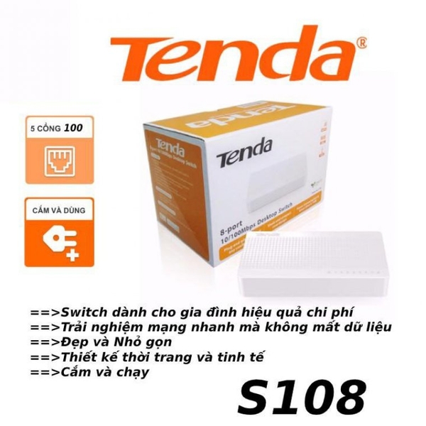 Switch tenda 8 port S108 , MINI Fast Ethernet chuyển mạch, nhỏ gọn và tinh tế, được thiết kế đặc biệt cho các doanh nghiệp nhỏ. With dễ dàng cài đặt, tốc độ chuyển tiếp cao và chế độ kết nối tự động đàm phán cổng, nó hỗ trợ Auto MDI / MDIX, địa chỉ MAC học tập / lão hóa tự độngvà tích hợp bảng MAC 1K.