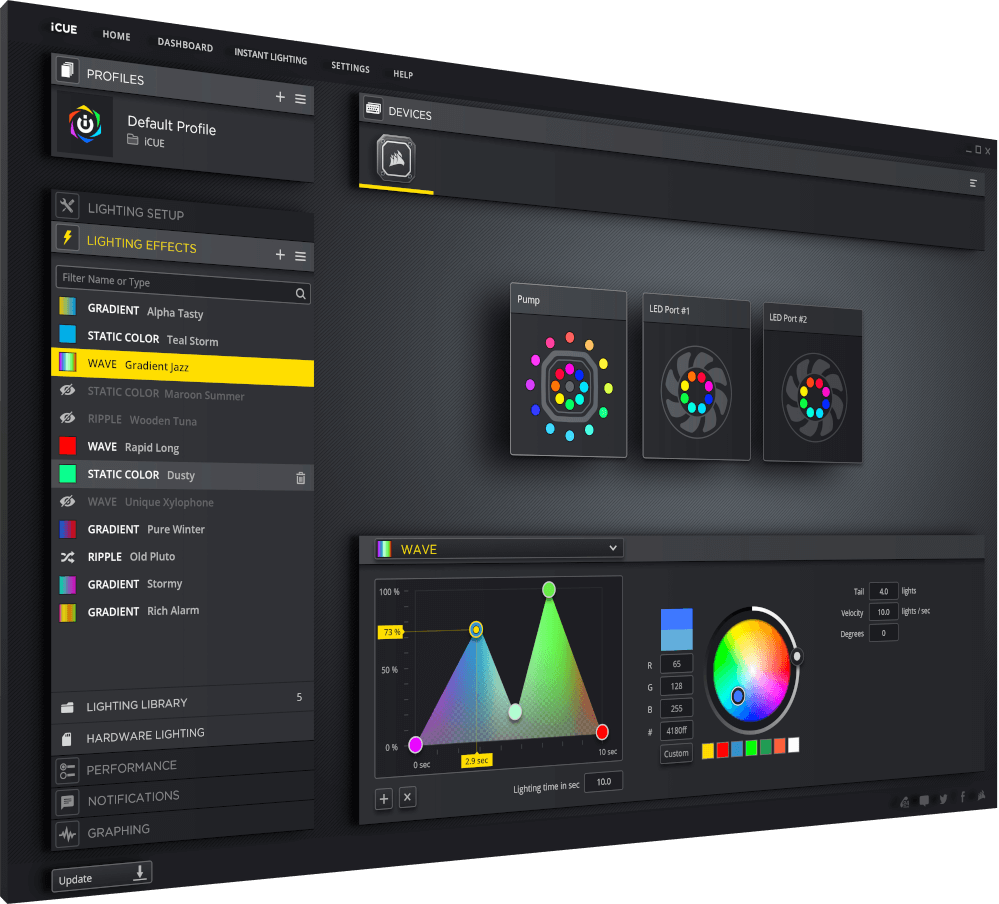 Phần mềm iCUE Phần mềm iCUE cung cấp cho bạn khả năng tùy chỉnhvà đồng bộ hóa ánh sáng RGB của bộ làm mát với tất cả các thiết bị tương thích iCUE, theo dõi nhiệt độ CPU và nước làm mát cũng như điều chỉnh tốc độ quạt và máy bơm, tất cả từ một giao diện trực quan duy nhất. |