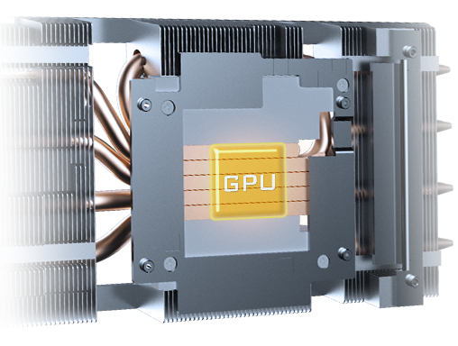 Ống dẫn nhiệt bằng đồng nguyên chất tối đa hóa diện tích tiếp xúc trực tiếp với GPU. Ống dẫn nhiệt cũng bao phủ VRAM thông qua một tấm kim loại lớn tiếp xúc để đảm bảo làm mát tối đa.