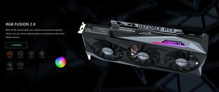 RGB FUSION 2.0 Với 16,7M tùy chọn màu có thể tùy chỉnh và nhiều hiệu ứng ánh sáng, bạn có thể chọn hiệu ứng ánh sáng theo sở thích cá nhân hoặc đồng bộ hóa với các thiết bị AORUS khác.