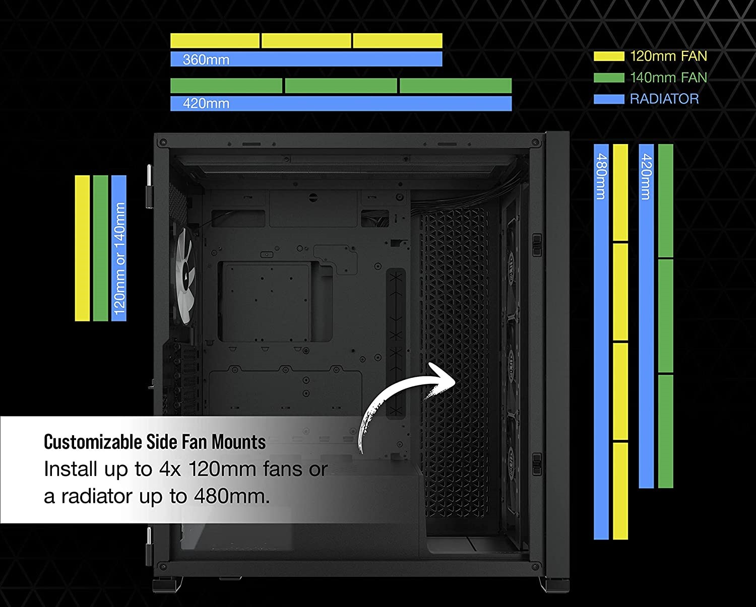 Khả năng không giới hạn 7000X RGB với nột thất rộng rãi, phù hợp với khả năng lắp Fan tối đa lên 12 x 120mm hoặc 7 x 140mm. Ngoài ra có thể lắp lên đến 3 bộ tản nhiệt 360mm hay 2 bộ 420mm, thậm chỉ có thể lắp được bộ 480mm. |