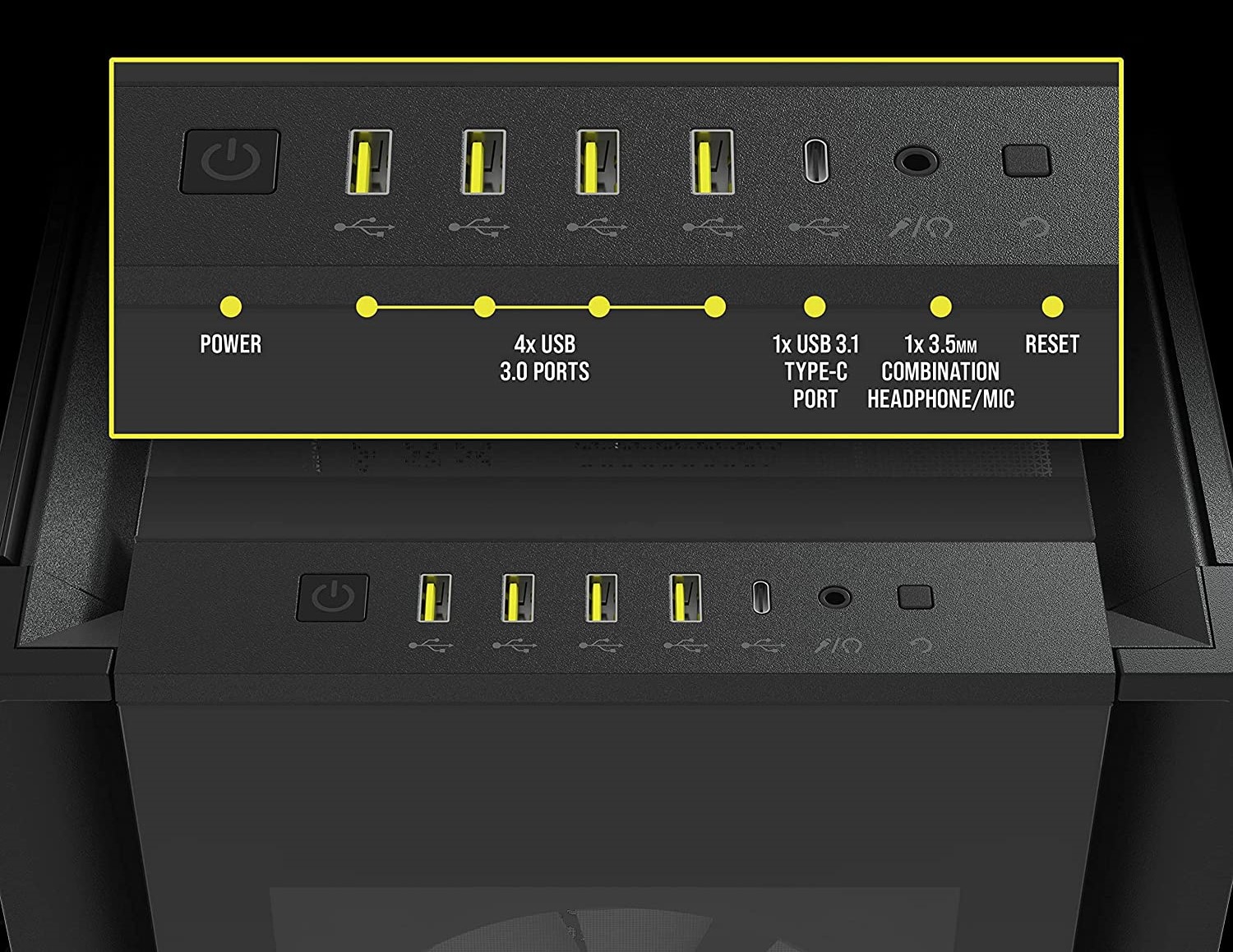 Cổng kết nối Bảng điều khiển I / O mặt trước bao gồm cổng USB 3.1 Type-C, 4 cổng USB 3.0 Type-A và giắc cắm âm thanh/ micrô kết hợp. |