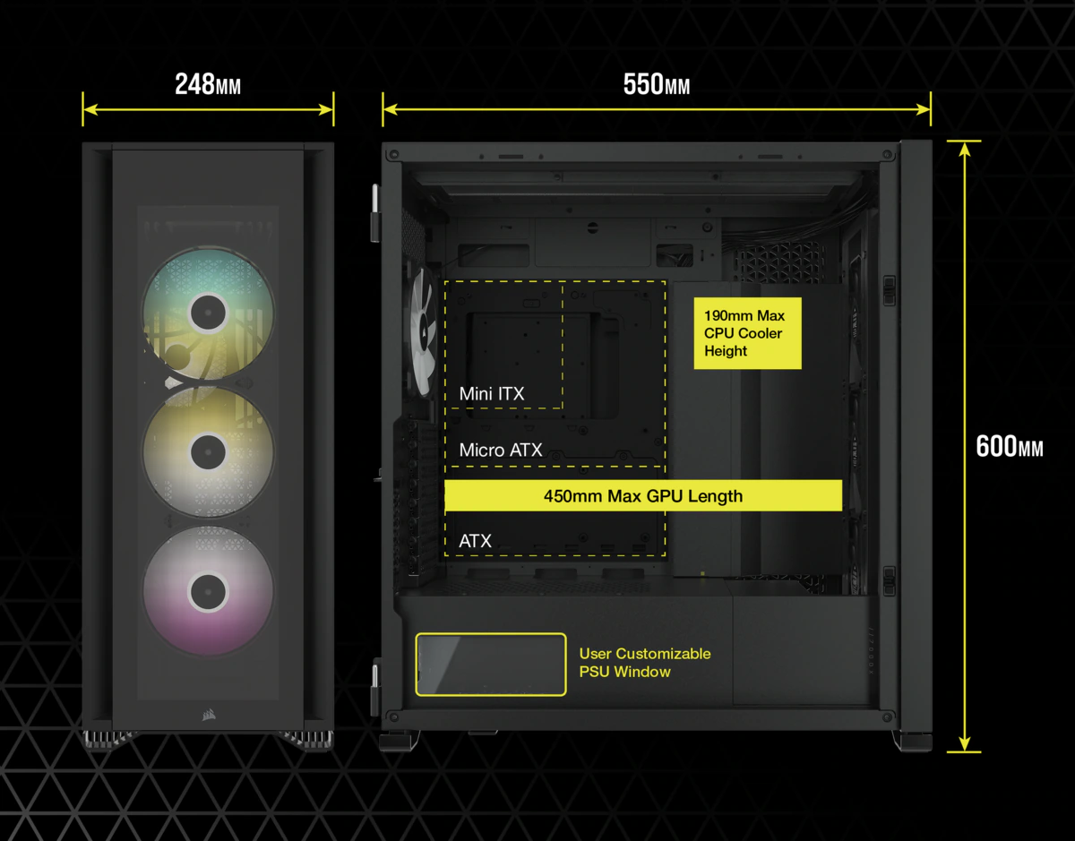 Tăng cường khả năng làm mát Được trang bị bốn Fan CORSAIR 140mm RGB có công nghệ AirGuide với cánh gạt chống xoáy để tập trung luồng không khí và tăng cường khả năng làm mát. |