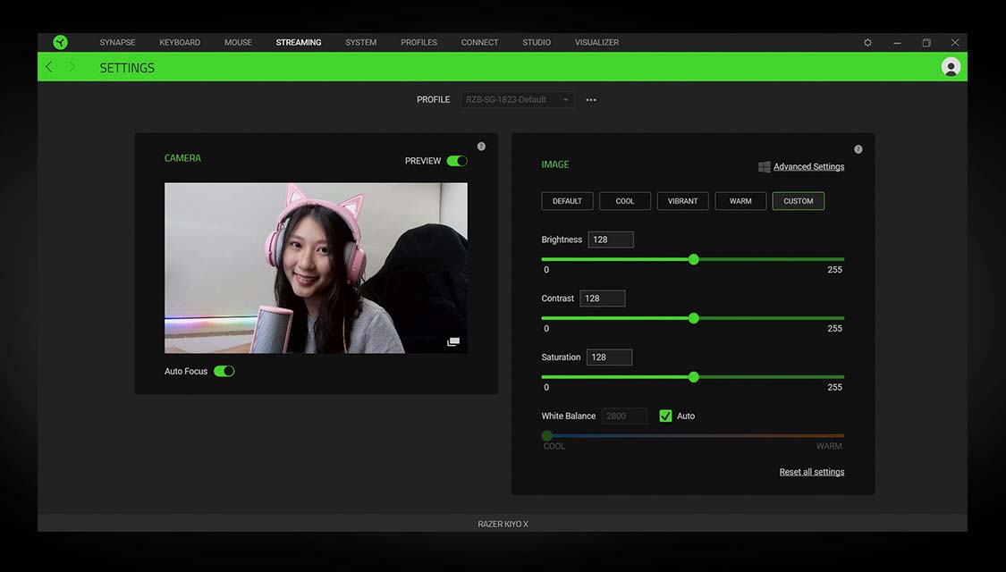 Tùy chỉnh hoàn hảo Webcam máy tính Razer Kiyo X Cmang đến cái nhìn hoàn hảo với khả năng tùy chỉnh cấu hình một cách dễ dàng và lưu cài đặt video thông qua phần mềm Razer Synapse: